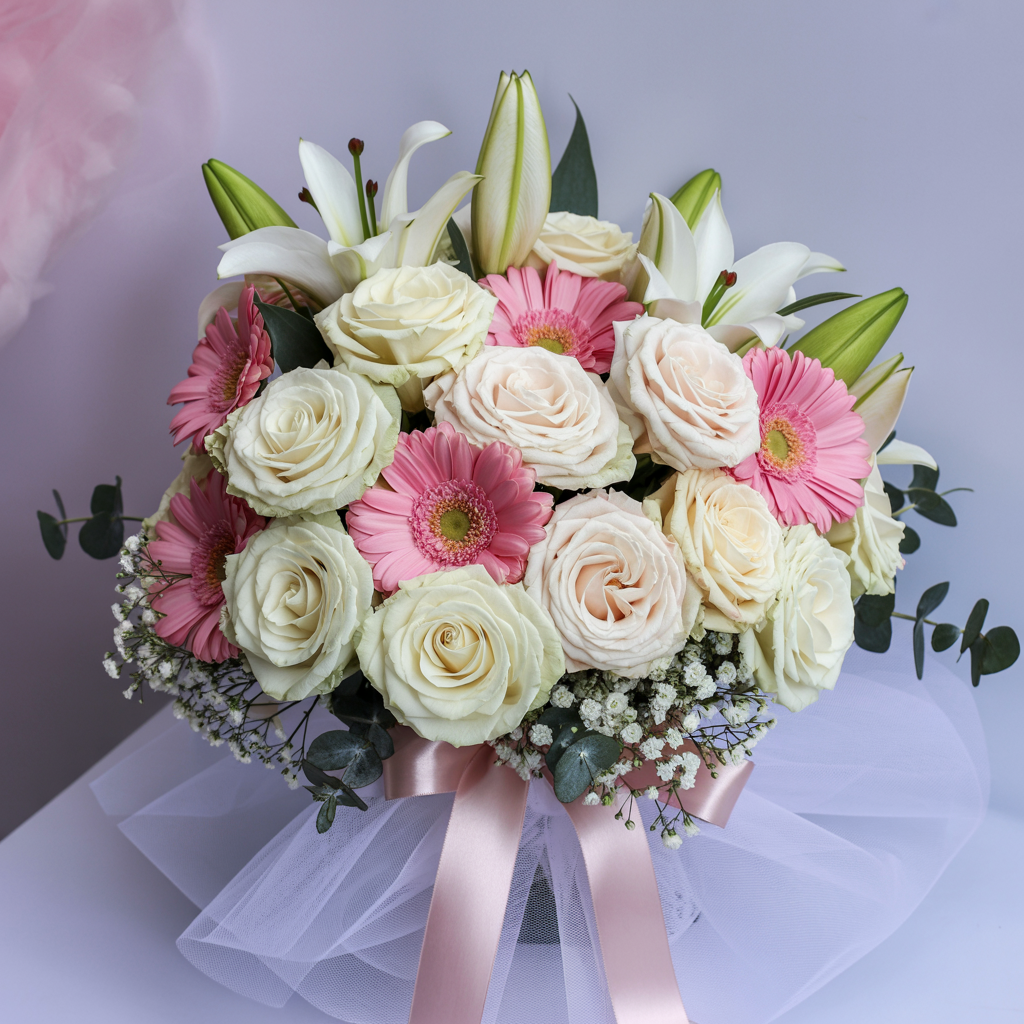 Un raffinato gioco di purezza e grazia, questo bouquet avvolge con la sua delicatezza. Le rose bianche, insieme ai gigli e alle gerbere, creano un'armonia di emozioni sublimi. Perfetto per ogni occasione speciale che merita un tocco di lusso. ✨