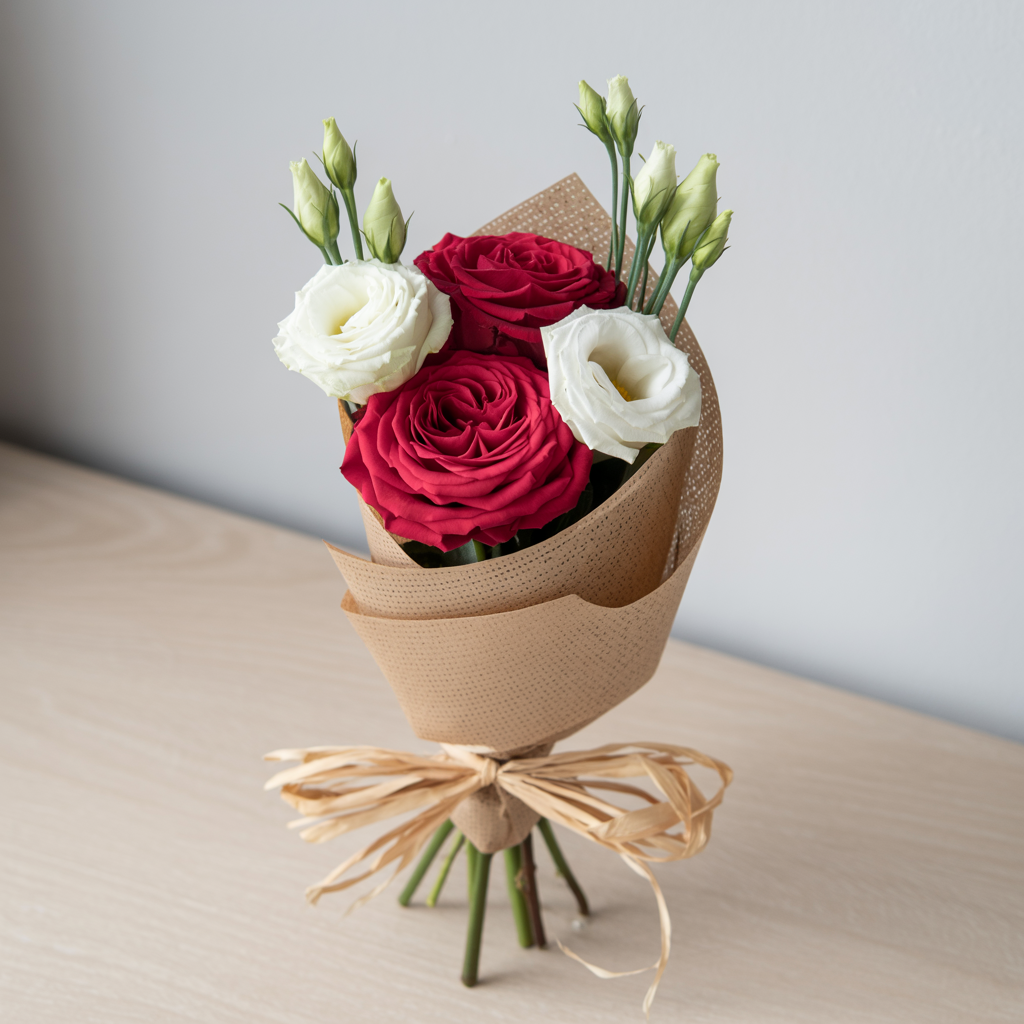 Le rose rosse simboleggiano l’amore ardente, mentre i lisianthus bianchi portano purezza e raffinatezza.